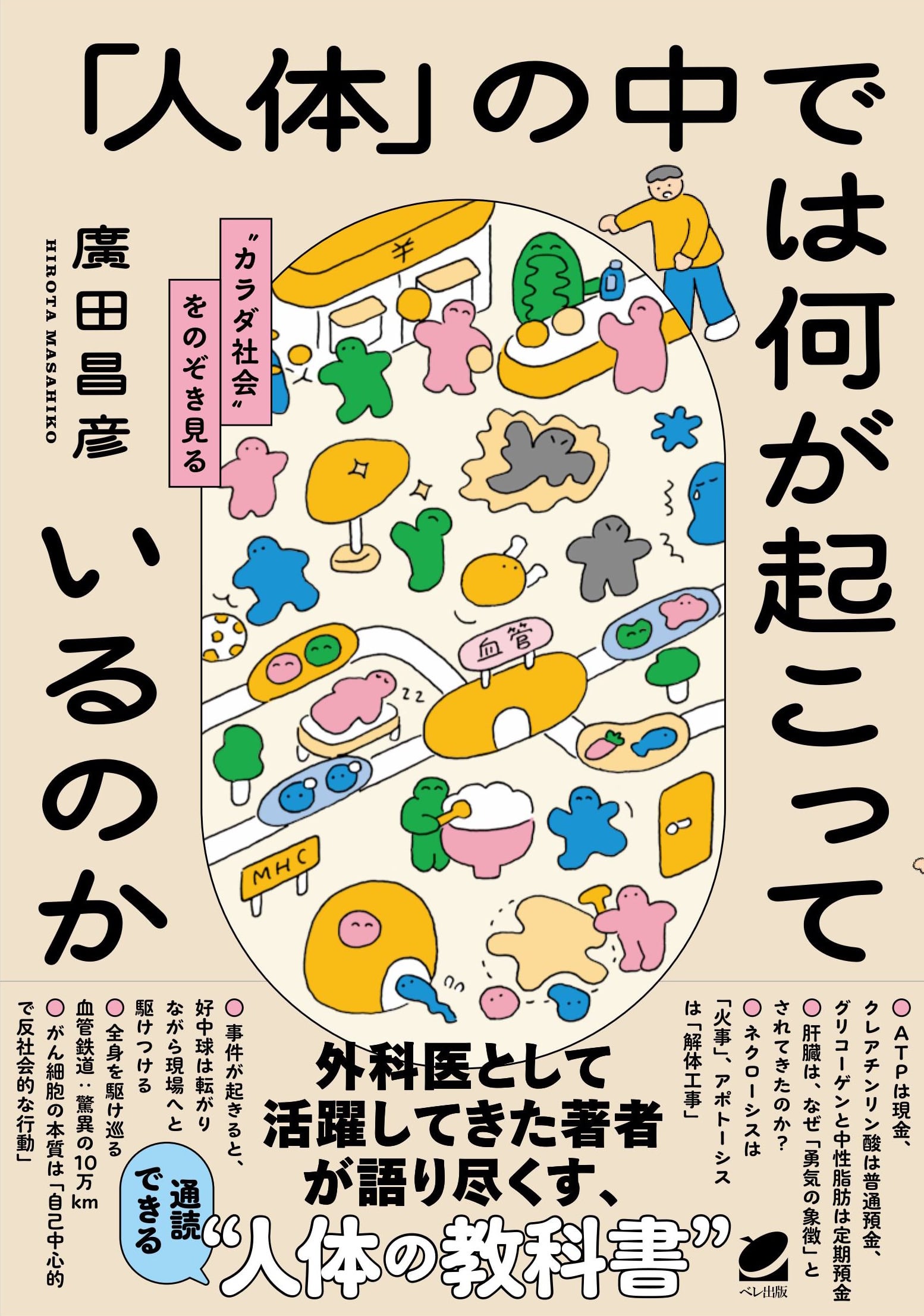 膵臓がんを主たる専門とする外科医である著者が、人体について、人体を形成している細胞について易しく解説します。細胞内の現象、生体内の現象、ヒト社会の現象、それらはすべて、内界と外界とのコミュニケーションから成り立っています。これらの巧妙な仕組みを、それぞれのレベルで対比して考えてみると、どのレベルの世界にも同じような社会現象があるということがわかって面白いものです。生体内のことや、ましてや細胞内のことには、わかっていないことも非常に多く、神秘に満ちあふれています。このようなまだわからない現象も、現実のヒト社会の現象にあてはめて考えてみると、腑に落ちて理解しやすくなることがあります。実社会の事象や人物、物事、音楽・映画作品などへの喩えもふんだんに交えながら展開される「人体」の話は深く、興味深く、読者をその世界へと導きます。